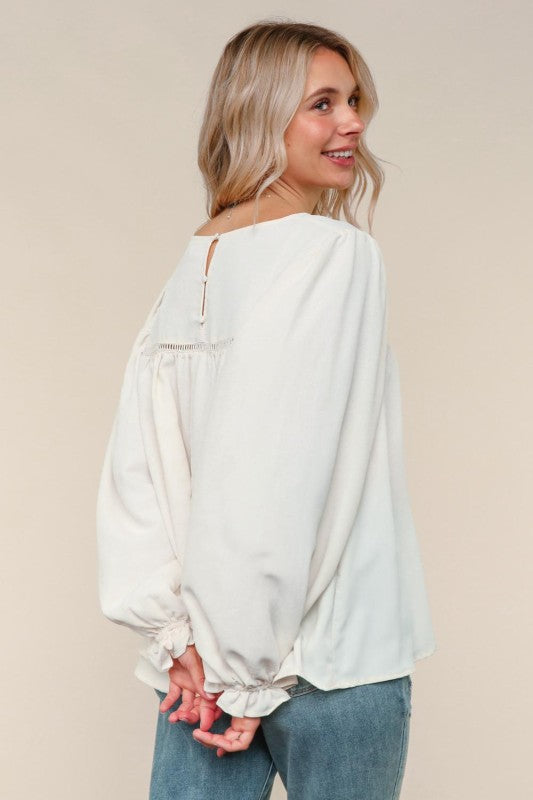 Long sleeve top with lace detail, and button down back